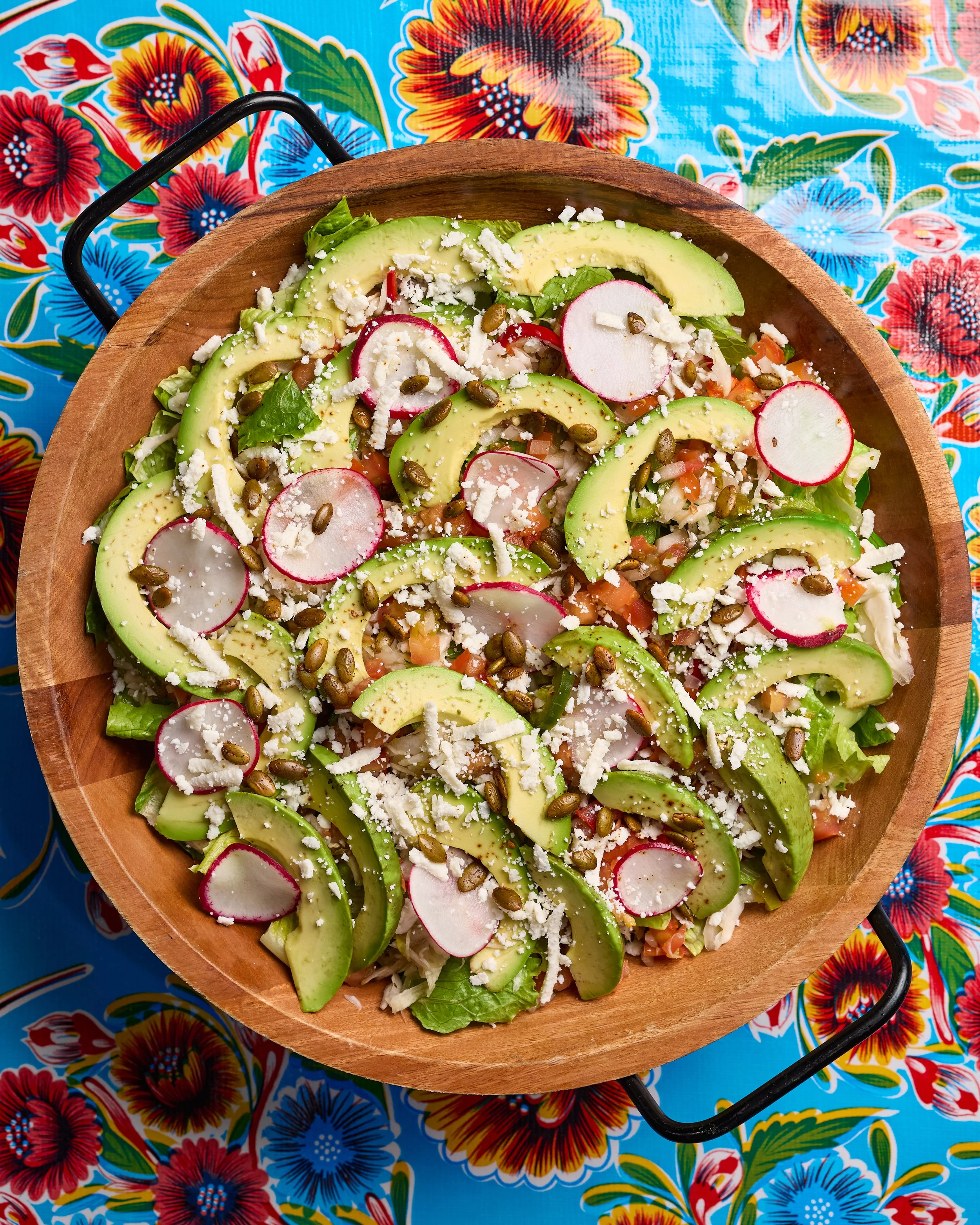 romaine hearts, pickled cabbage, radish, house pico de gallo, avocado, queso fresco, pepitas, roasted jalapeño vinaigrette