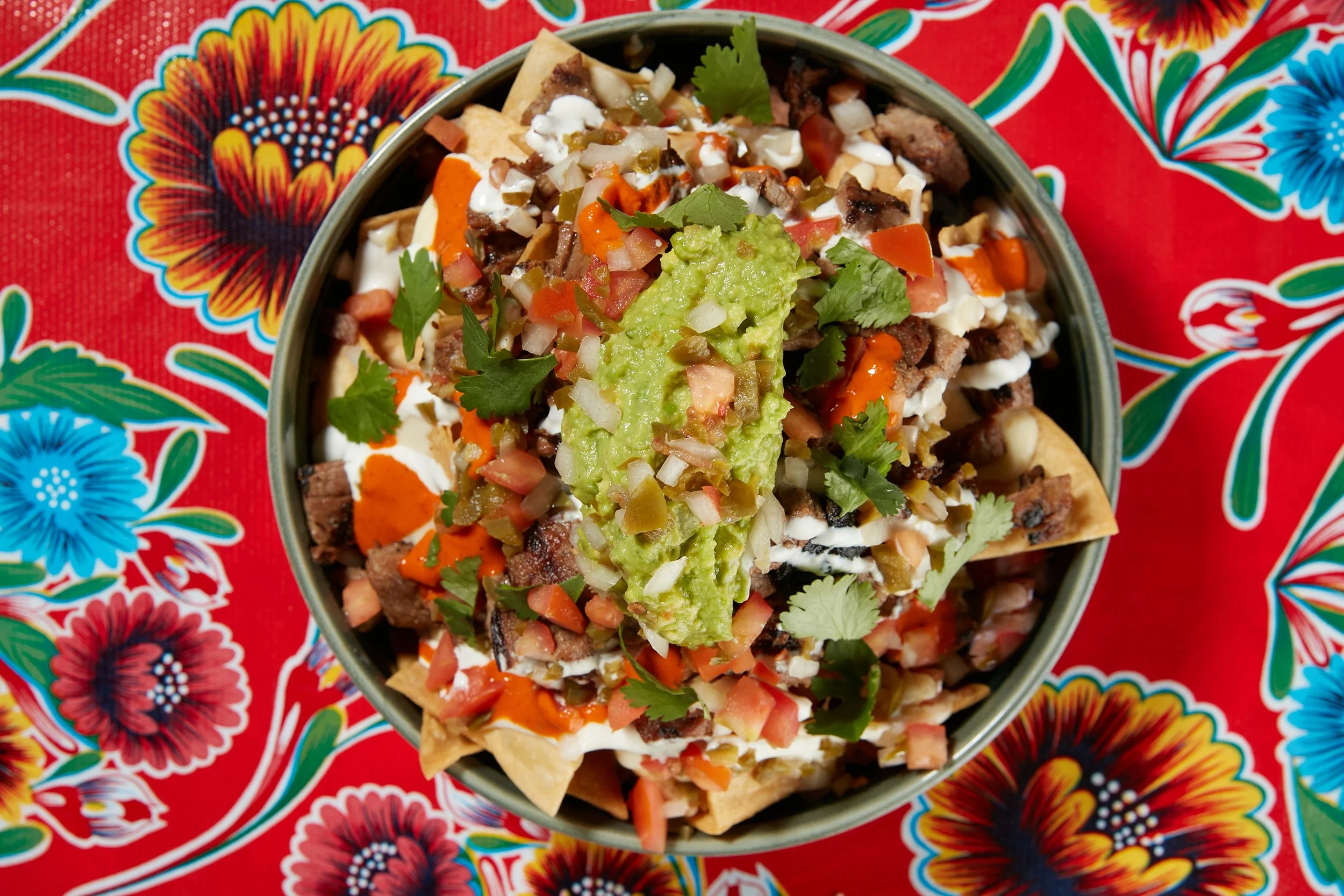 house cut tortilla chips, jack cheese blend, refried or mayocoba beans, & house pico de gallo